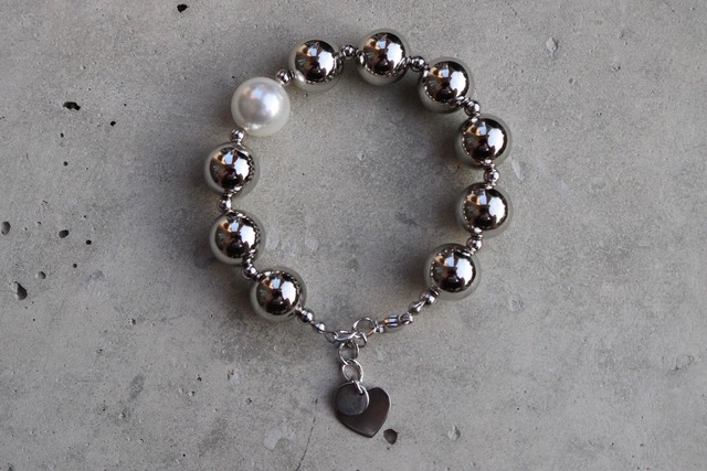 カラーシャツやシアーシャツの上から付ける 14mmメタリックボールと樹脂パールビーズを使用した 大ぶりブレスレット✵ 存在感抜群のデザインで、手首に華やかさをプラスします◎ シンプルな服にも合わせやすく、気軽にオシャレを楽しめるアイテムです。 BANDINGタグとハートチャームを付けた アジャスターを垂らしても可愛いデザインです。 ビーズで製作してるため 汗や水で濡れると変色する可能性があります。 衣服の上から着用することをおすすめします⚮ 【素材】 ◾︎14mm樹脂パールビーズ ◾︎ロジウムメッキビーズ 留め具:真鍮 チャーム:ステンレス 【カラー】 mixカラー ◾︎ロジウム(シルバーカラー) ◾︎1粒樹脂パールホワイト 【長さ(最大) & 重さ】 約21.5cm & 19 g サイズ調整可能なので フィット感をお好みに合わせて調整できます! ❁ラッピングしてお届けします 自分用はもちろん、プレゼントにもおすすめです!! 当商品もハンドメイドでお作りしてますので 丁寧な扱いをお願いいたします❃