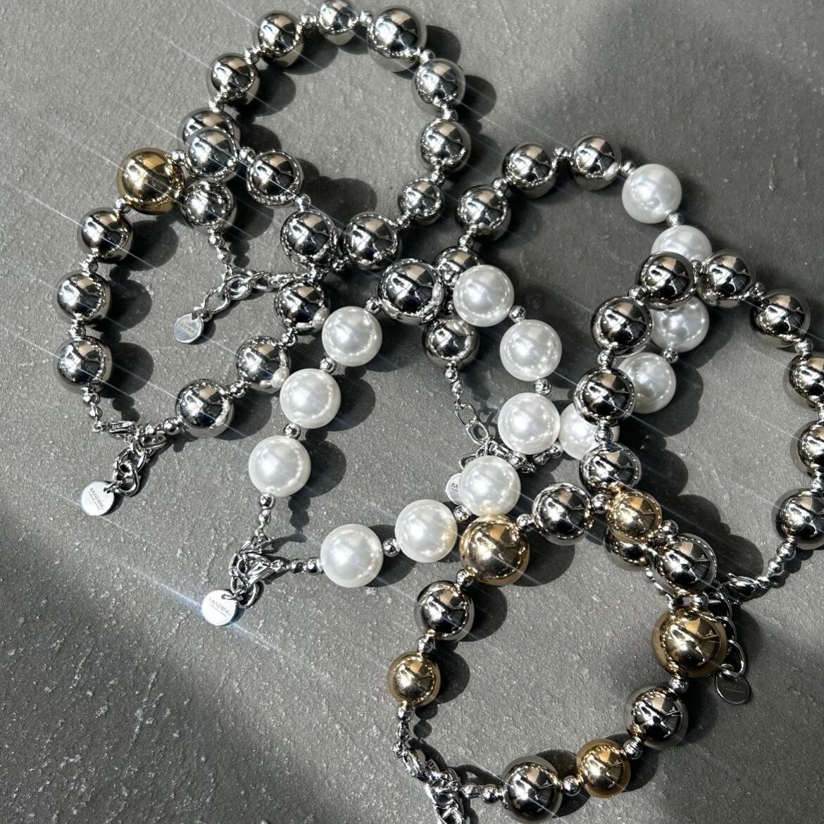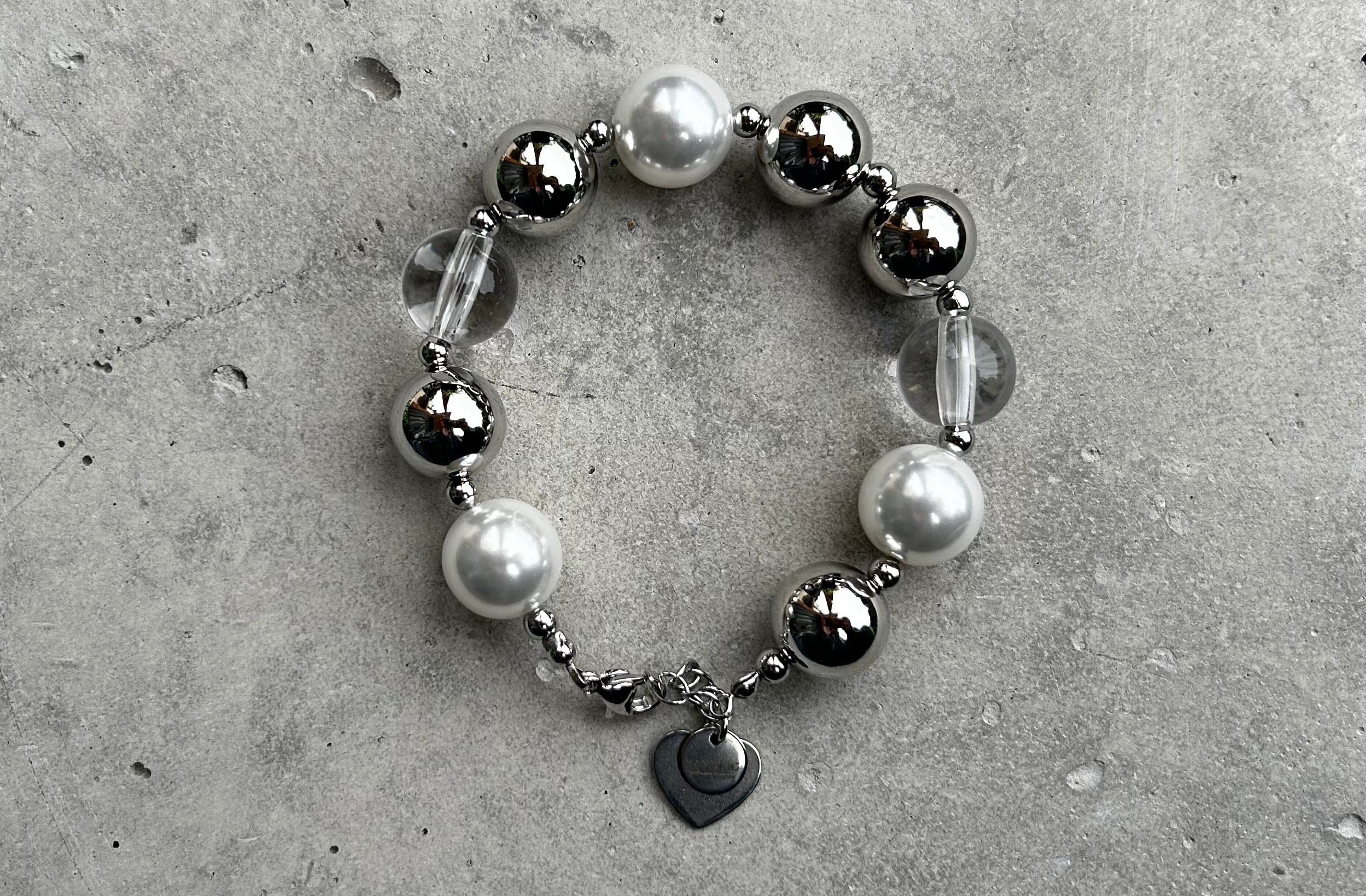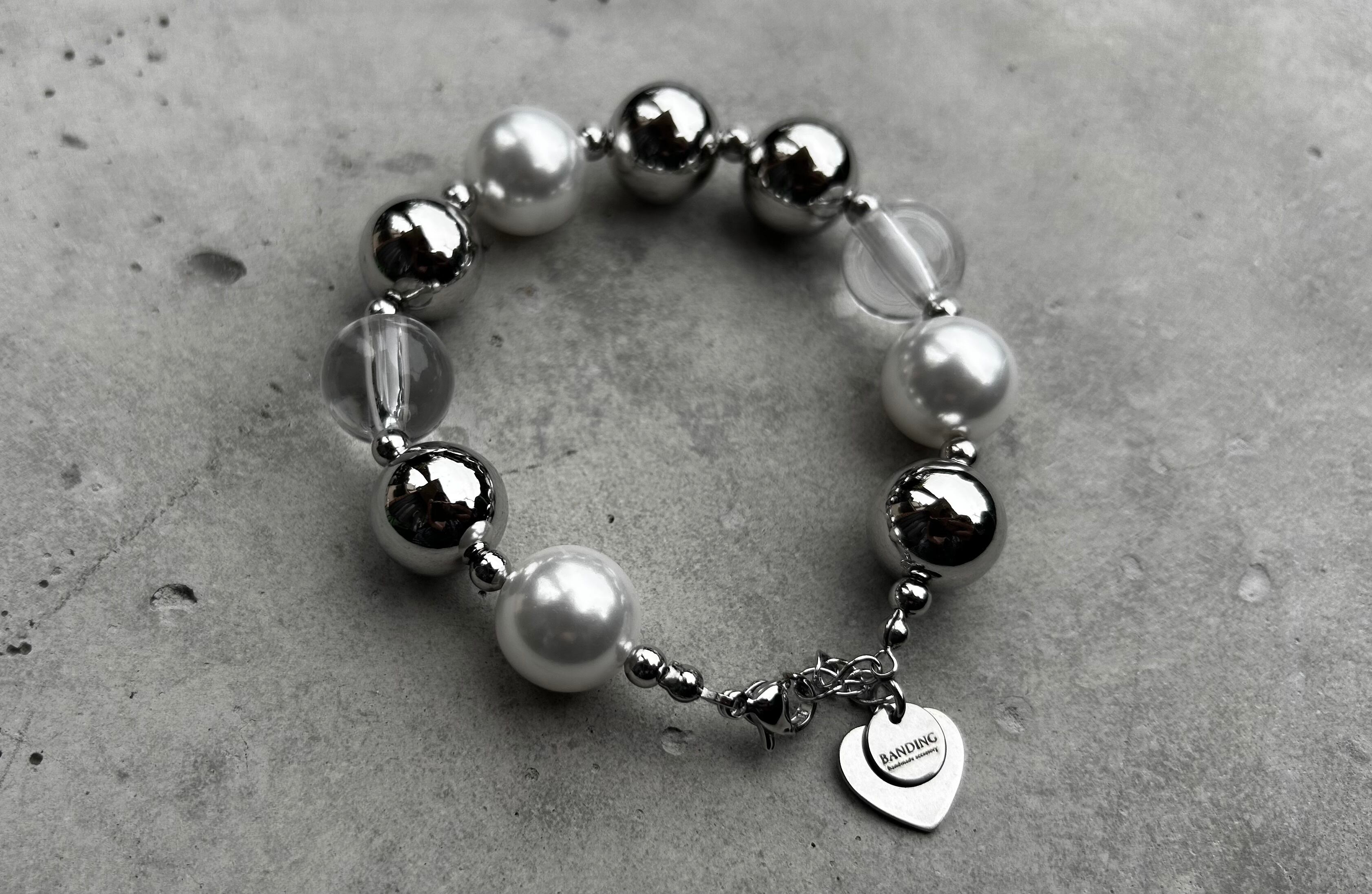14mmのメタリックボールと樹脂パールビーズとクリアビーズを使用した