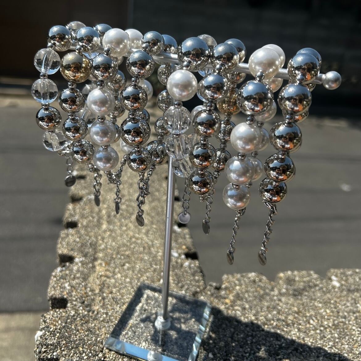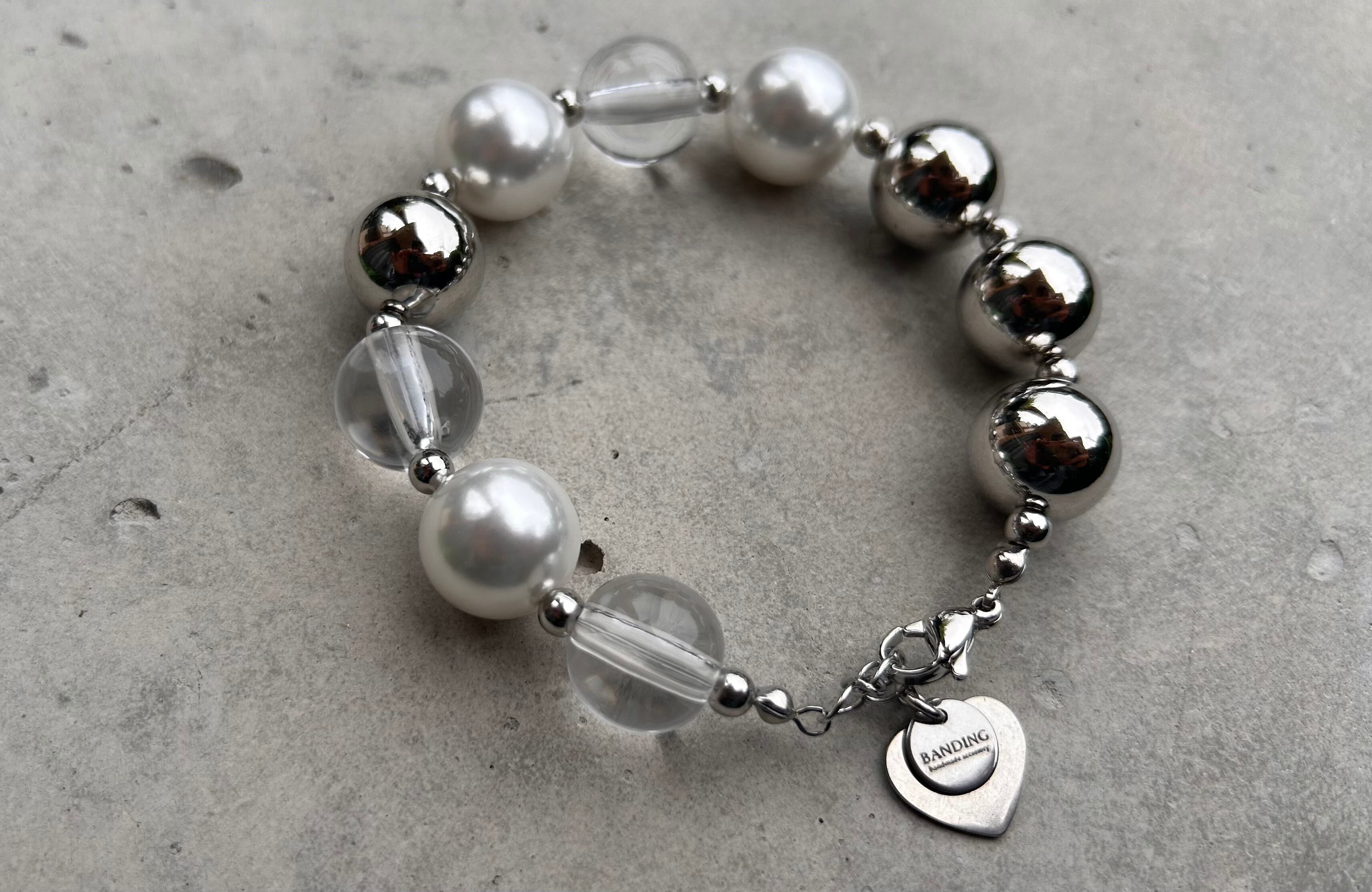 14mmのメタリックボールと樹脂パールビーズとクリアビーズを使用した